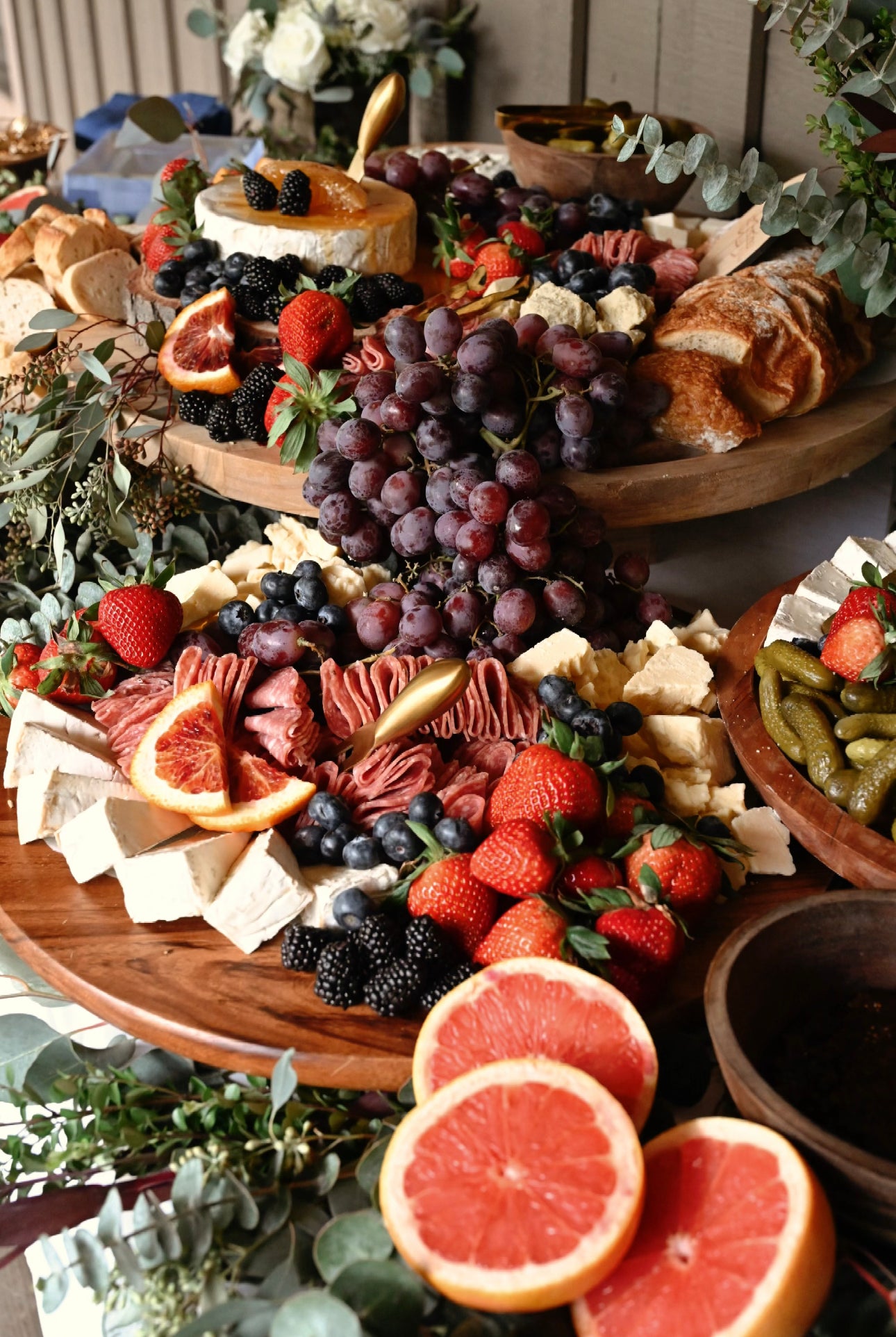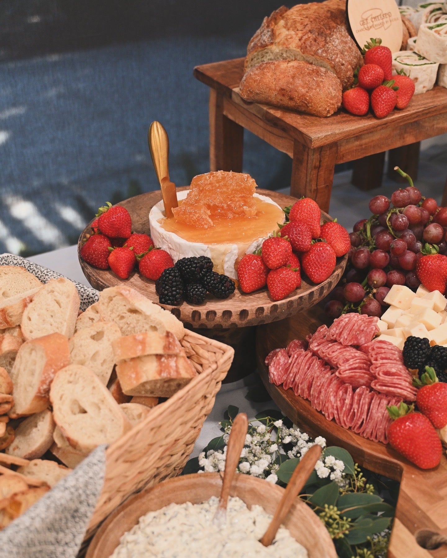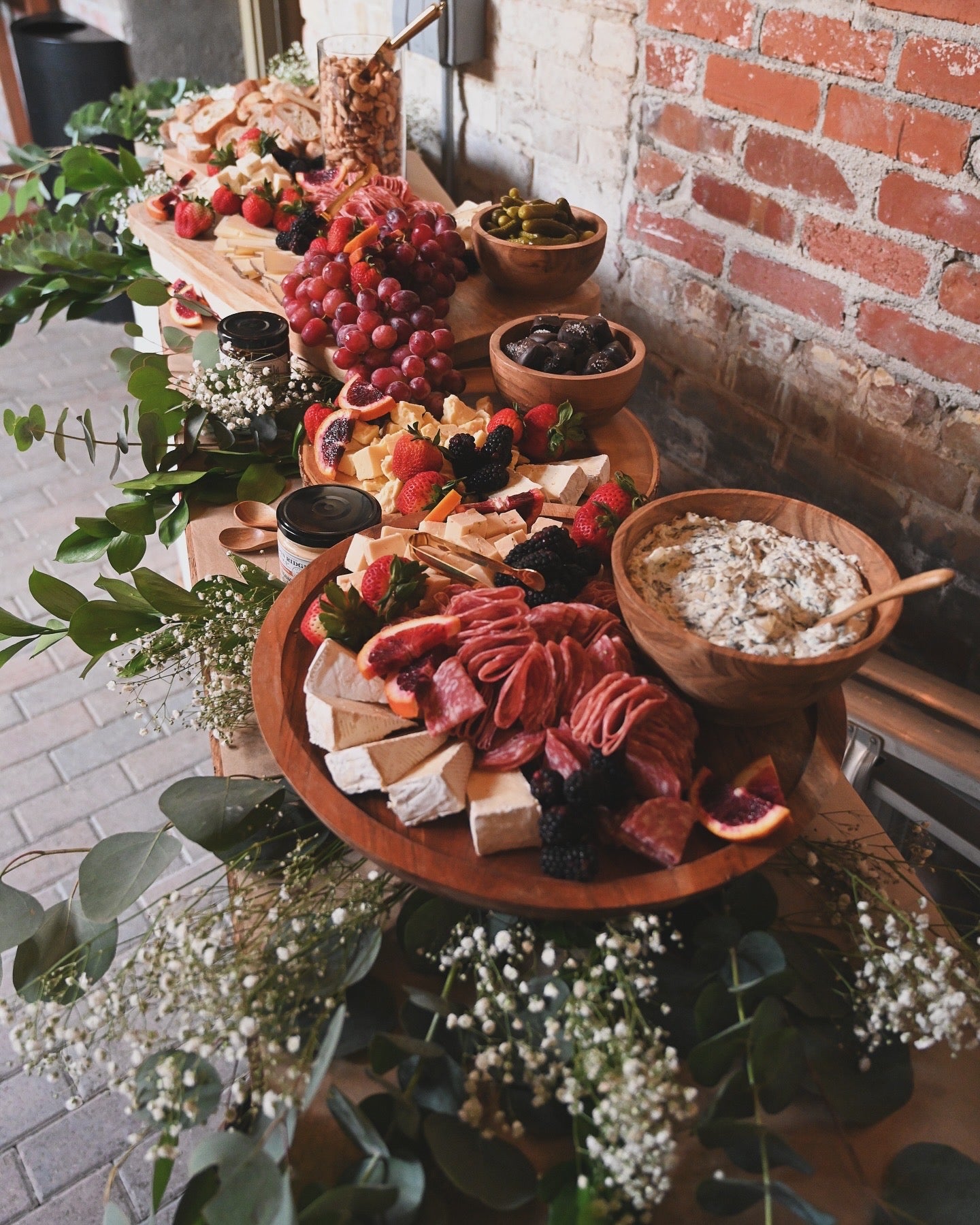 All tables feature an assortment of artisan and signature cheese, cured meats, including salami and prosciutto, seasonal fruits & vegetables. Jams, honey, & dips. Bread & artisanal crackers/flatbreads are also provided. All tables are garnished beautifully with pickled items, assortment of nuts, dried fruit, & chocolate. Additional items available upon request.